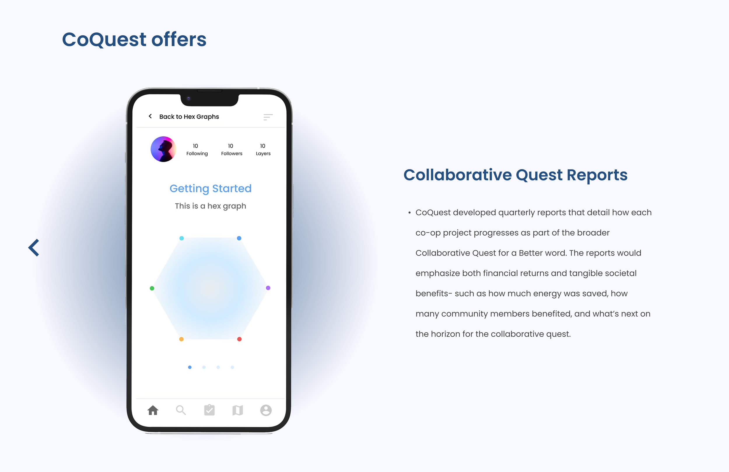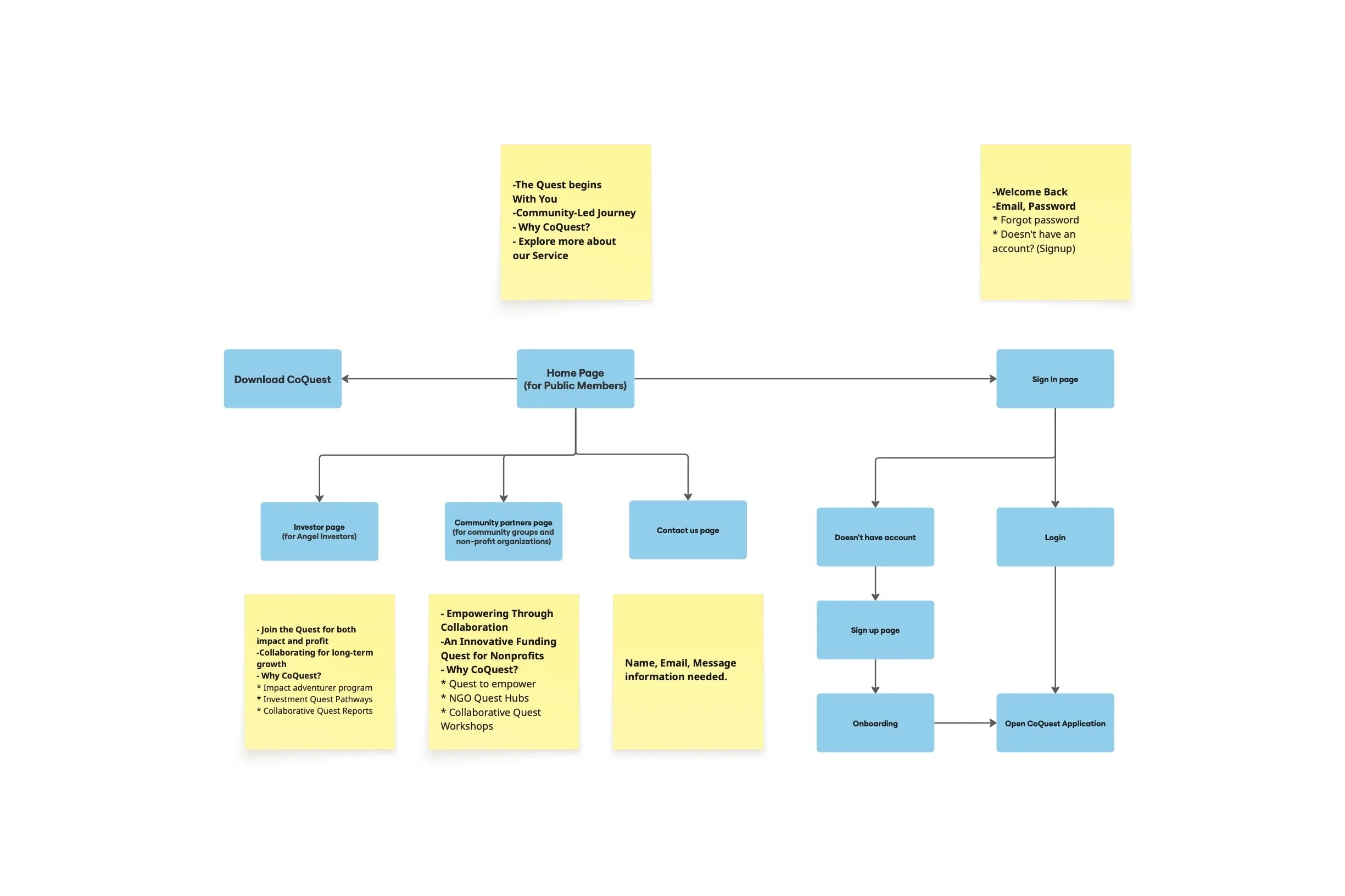 We created pages tailored to each target audience, and now, each audience has its own theme color that aligns with the CoQuest logo: blue for public users, navy for investors, and green for community groups.